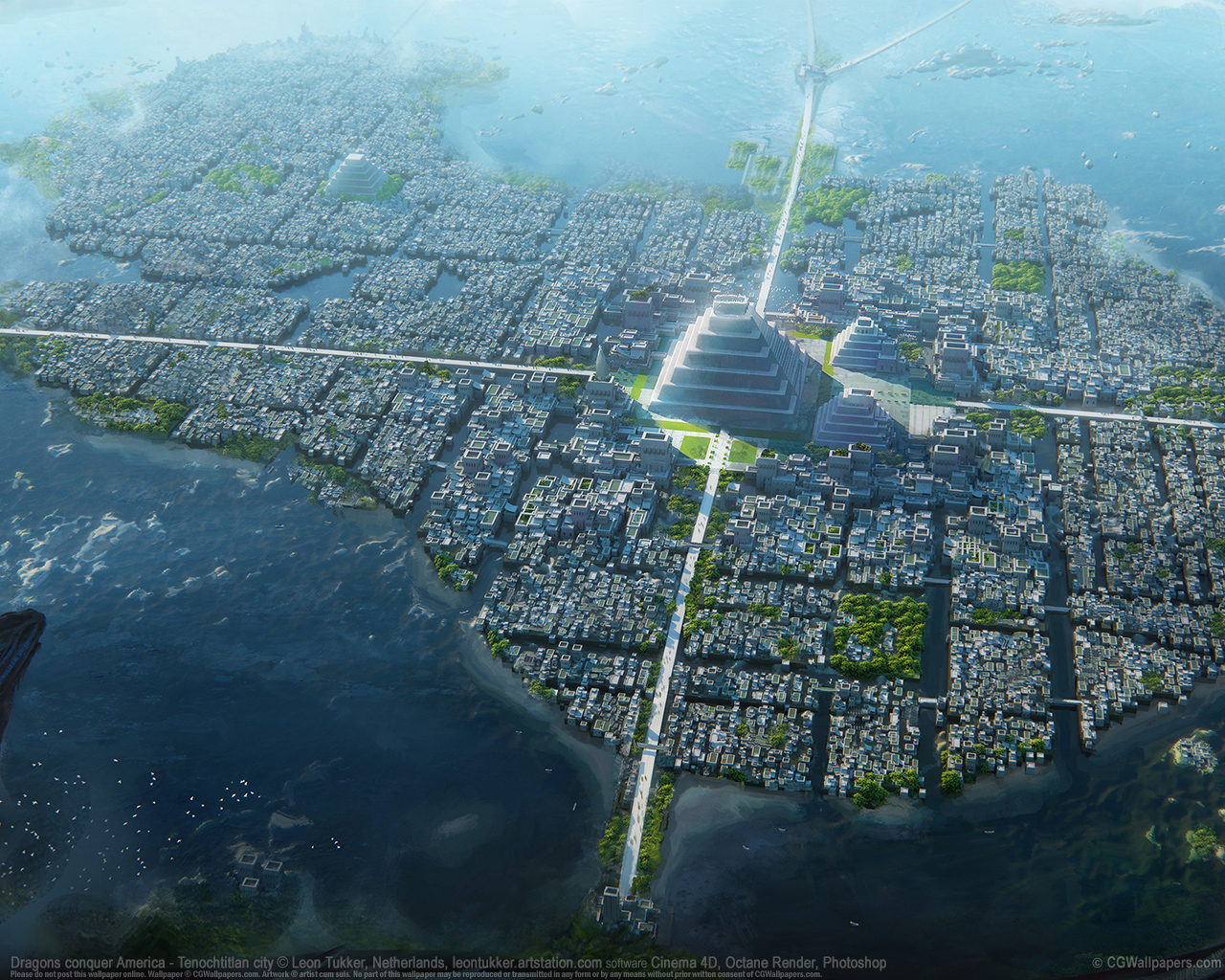 Dragons conquer America - Tenochtitlan city © Leon Tukker, Netherlands software Cinema 4D, Octane Render, Photoshop